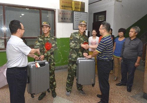 明升M88 领导为入伍学生佩戴红花并赠送了行李箱等生活用品,全体与会人员与两名入伍学生合影留念。